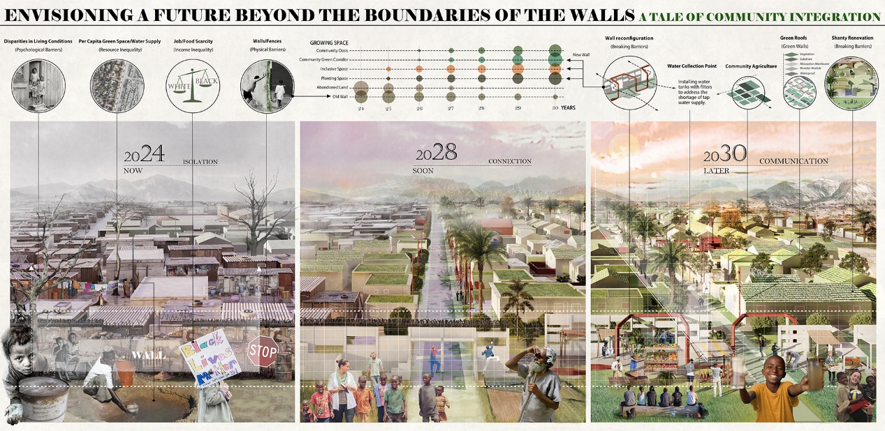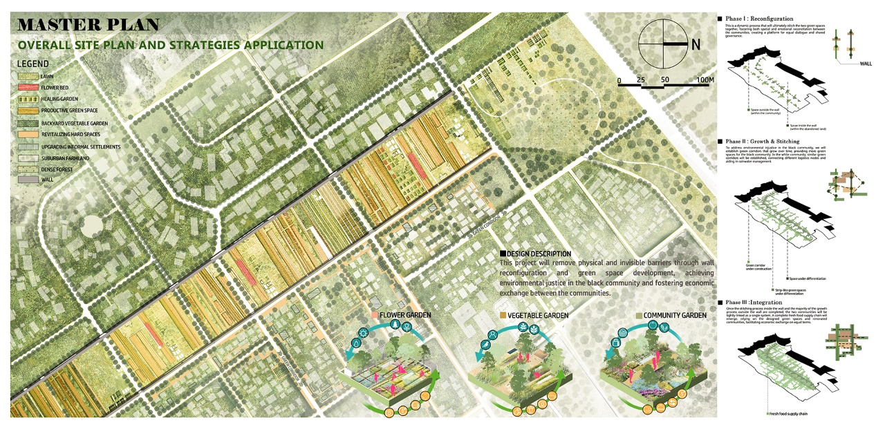 针对该地区存在的严重住宅隔离和种族不平等问题,我们提出了“联结绿洲”的概念,旨在实现生长和缝合(图4)。基于此,我们提出了一项战略以对墙体进行重新配置与改造,促进双方社区的交流,从而恢复社会公平,以响应“ASLA的种族公平行动计划”(图5)。该项目将通过墙壁的重新配置和绿色空间开发,消除两边物理上的阻隔和双方心中无形的隔阂,实现黑人社区的环境正义,并促进双方社区之间的经济交流。