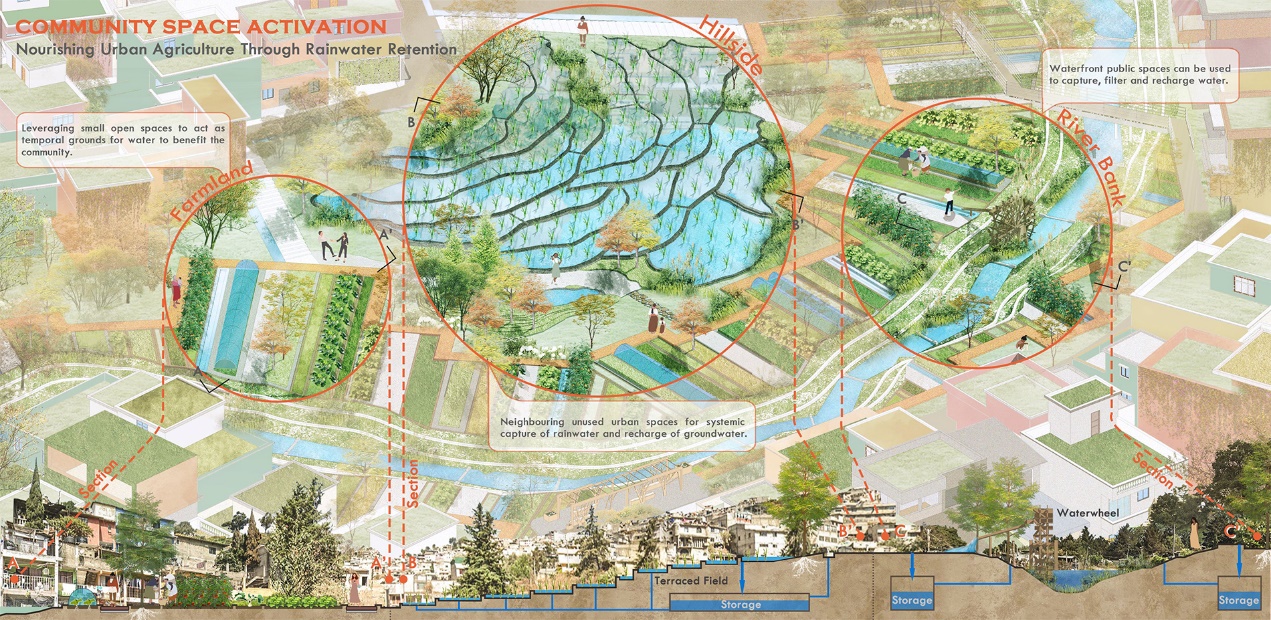 为高效利用雨水,我们融合城市农业,对居民区屋顶、立面及小微空间进行革新改造。取水站作为居民家庭用水的补充;屋顶水罐与家庭农场系统联通,为新增种植区供水;公共空间雨水则滋养城市绿化与农业景观,夏日里更可降温消暑。此举不仅满足生活、经济和公共景观用水需求,还减轻城市排水压力,显著提升城市环境质量(图13、14)。