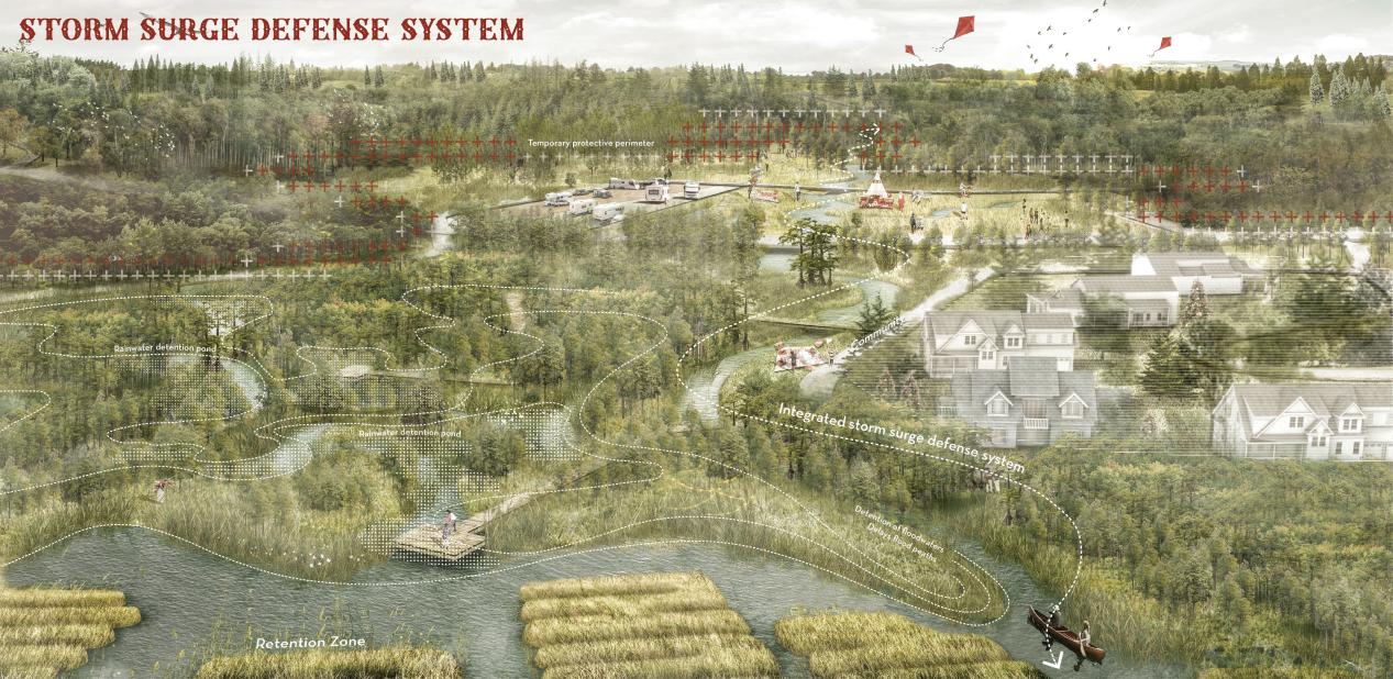 同时,我们基于场地关键词找到了相关网络资料。相关学者的研究证实了Jackeys Creek沿岸杉树大量死亡所导致的物种减少和社区暴露问题。这些背景资料为我们应对幽灵森林问题和周边社区日益迫切的风暴潮威胁提供了策略依托,有助于我们制定更加有效的生态修复和社区保护策略,重建区域的生态平衡和人居环境安全。