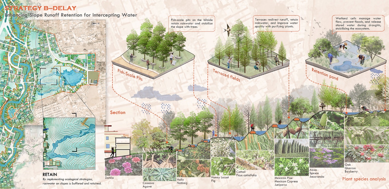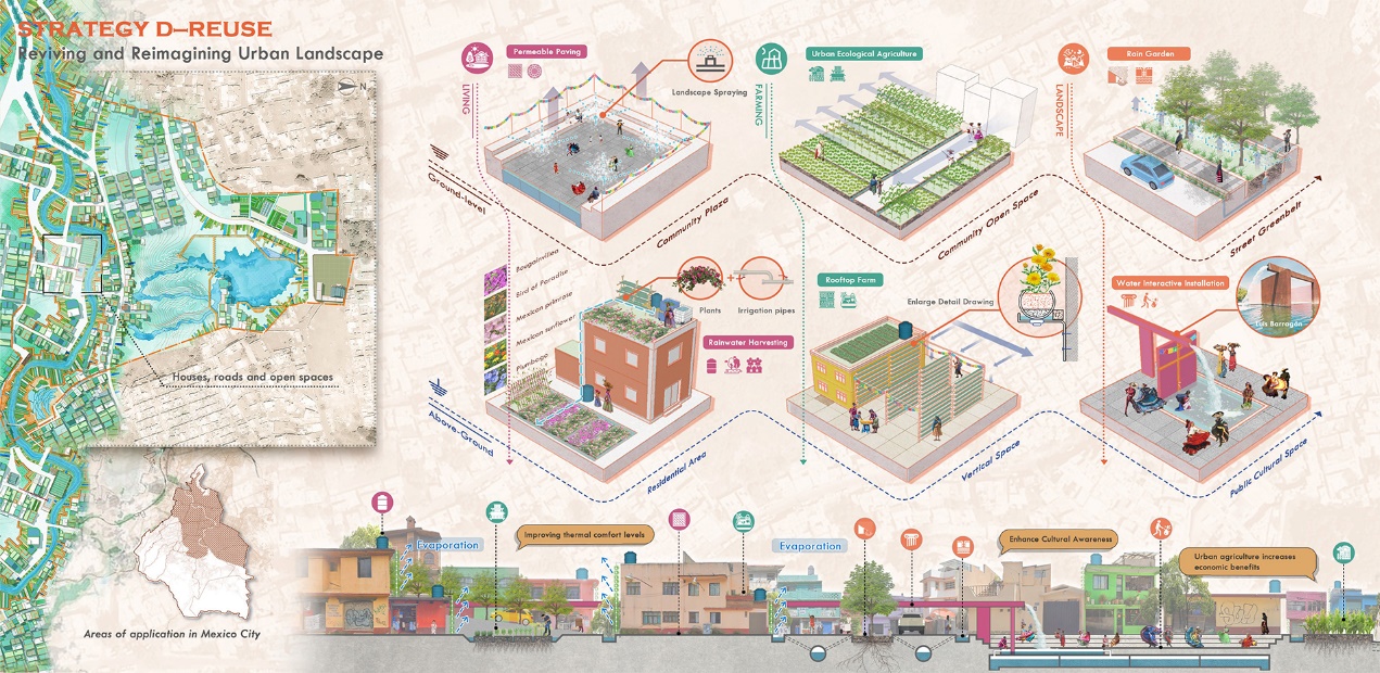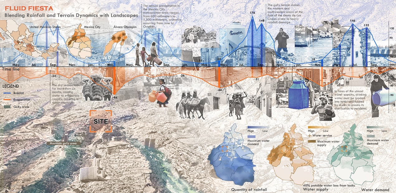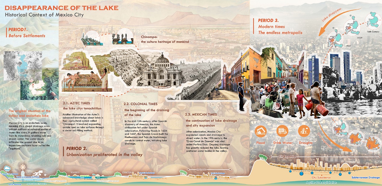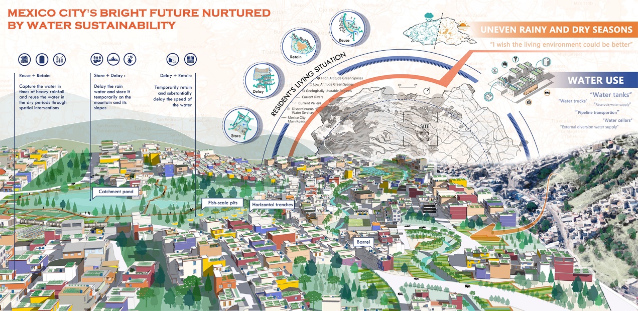 本项目聚焦墨西哥城季节性水问题,深挖历史成因与民生现状,为典型区域定制改造方案。通过景观基础设施的创新,灵活调配城市水资源,实现自然、城市、生活与宗教文化的和谐共生。项目旨在促进墨西哥城水资源可持续利用与环境可持续发展,通过典型区域示范,构建景观基础设施工具包,融合自然水循环与城市生活,提升居民生活质量、经济生产和生态环境,同时繁荣宗教文化。