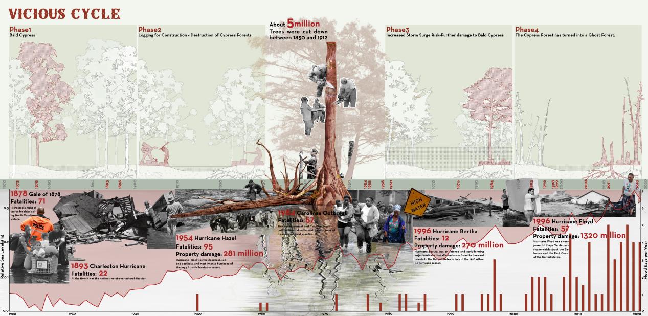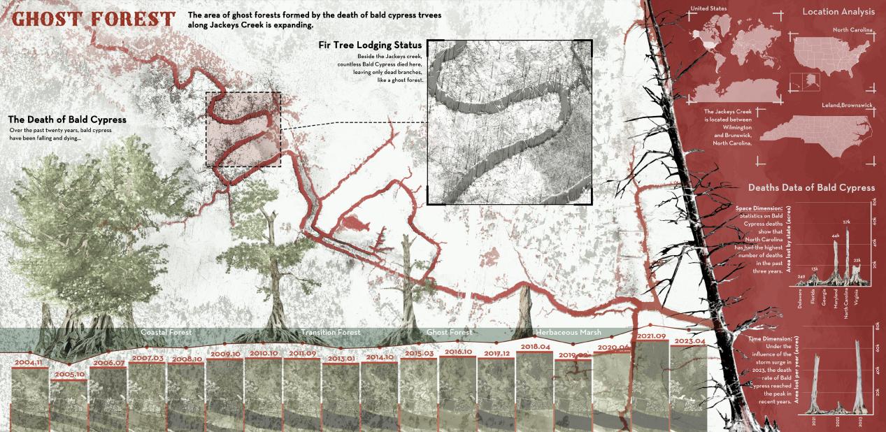 Leland镇南部的Jackeys Creek曾是一片生机勃勃的杉树林,随着大规模城镇开发和频繁风暴潮的双重冲击,流域周边逐渐退化成了“幽灵森林”。每一次盐水的涌入都在侵蚀这片土地,导致不可逆转的生态破坏,多个生物物种也因此消失。特别是落羽杉,这一地区的生态支柱,正在逐步消亡,这预示着整个生态系统面临崩塌(图1)。