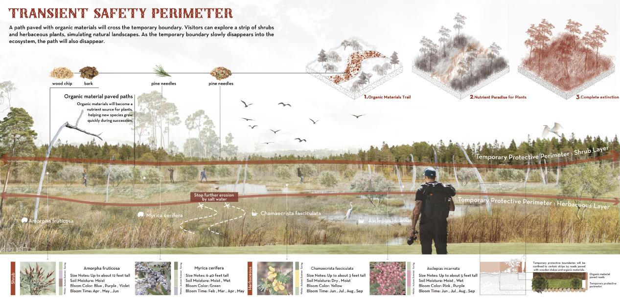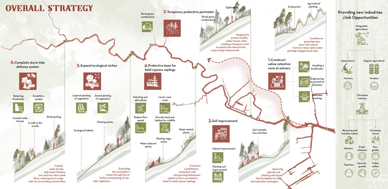 项目从恢复落羽杉生境的角度出发,在复生前期项目将通过两条策略路径抑制盐水侵蚀,同时对沿岸盐碱土进行改良。复生中期将构建草本植物为主的群落,并利用植物措施扩充新生态系统的生态位,最终将在Jackeys Creek沿岸形成较稳定的落羽杉生态系统,新的生态系统也是一套完整的风暴潮防御系统。通过这一战略,不仅保护了落羽杉这一关键生物主体,还提升了社区的生态安全与防御能力,为当地居民提供了更安全的生活环境(图4)。