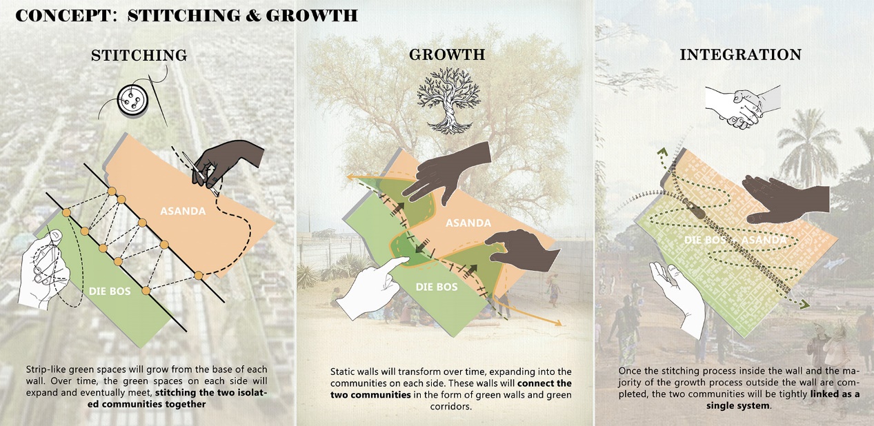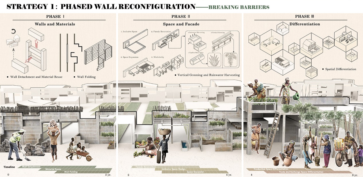 总体策略包含生长与缝合两个概念。其中生长的概念将应用于墙壁及其周围的社区。静态的墙壁将随时间转变,被不断改造,形成的空间又不断分化,最终向两侧社区扩展。这些墙壁不再仅限于混凝土结构,它们将以绿色墙和绿色走廊的形式连接两个社区。墙体将承担雨水收集与净化、农产品产出等职能,同时分化出的空间又为新鲜食物供应链的形成提供了物理条件(图7)。