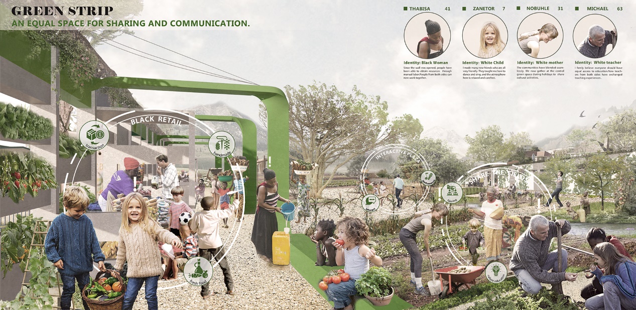 在双方社区内,我们同样使用了“生长”的策略。为了解决黑人社区中的环境不公正问题,我们将建立随时间生长的绿色走廊,为黑人社区提供更多的绿色空间。这些走廊将沿着社区街道连接先前置入的各种改造空间,并与翻新的棚屋和绿色墙体结合。在较长的时间内(3-7年),社区居民的共同努力将延伸这些走廊,使得其连接整个社区。这些绿色走廊将有助于收集和净化雨水,其中种植的当地的水果和蔬菜有利于增加水和食物的供应(图12)。主要措施包含打通墙体、通过绿廊向外建设、通过行道树以及垂直绿化提高绿视率来形成绿墙。同时绿廊串联恢复社区内正式与非正式绿地,增加社区内绿地可达性与覆盖率,沿绿廊置入生活服务设施,提高居民幸福度同时连通经济产业,带动黑白人社区的交易往来(图13)。