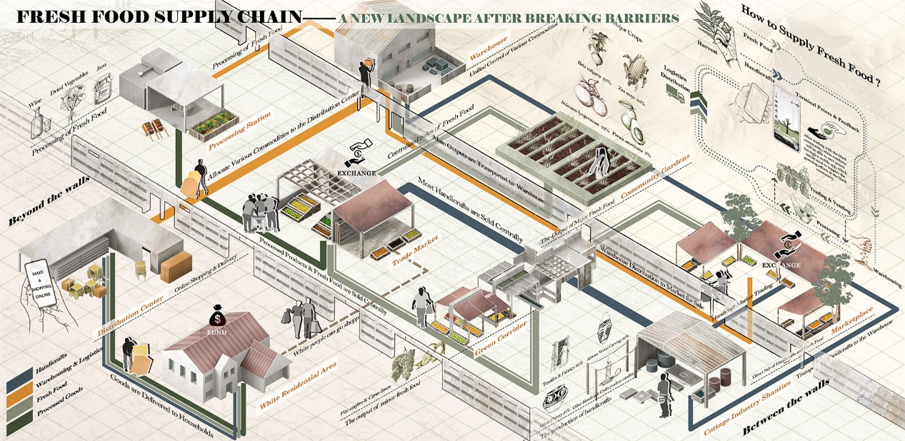墙体的改造使得新鲜食物供应链的建设成为可能。由黑人社区承担生产者的职能,进行对新鲜蔬果的采摘、加工、配送等活动。而白人社区对蔬果及其加工物的购买能够使得资金流入黑人社区,帮助黑人社区基础设施的建设并缓解失业问题,以此来促进两者社区间的资源再分配(图8)。