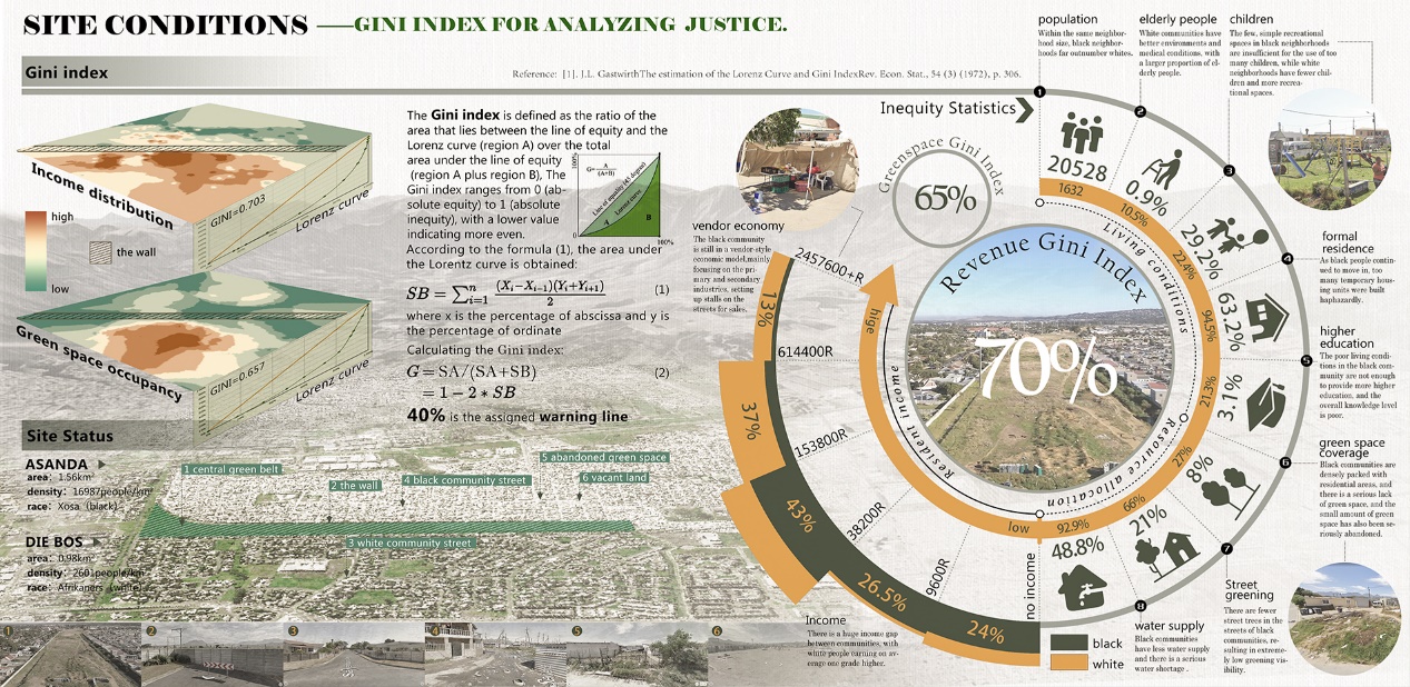 要解决场地内种族隔离与社会资源分配不等的问题,首先需要从两个社区的社会公平性入手。因此,我们深入进行了公平性分析。场地由于墙体在地理上的隔离,呈现出对黑白社区诸多不公平的待遇。这里主要介绍了场地基本信息,从生活条件、资源分配以及经济收入三个方面统计了不公的存在,通过计算社区内绿地占有和经济收入的基尼指数来将其极度不公的现象予以数据化(图3)。