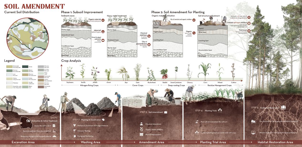 土壤改良是生态系统恢复的关键,包括基土改良和种植土改良两个方面。基土改良主要针对Jackeys Creek的底泥进行处理,以降低其中的污染物含量。种植土改良则通过将状况较差的倒伏杉树加工成木屑,并结合秸秆等有机物质,混入种植土中,以提升土壤肥力。我们将通过种植试验,确保改良后的土壤适合农业生产和生态恢复的需求,为落羽杉及其他植物的健康生长提供坚实基础。