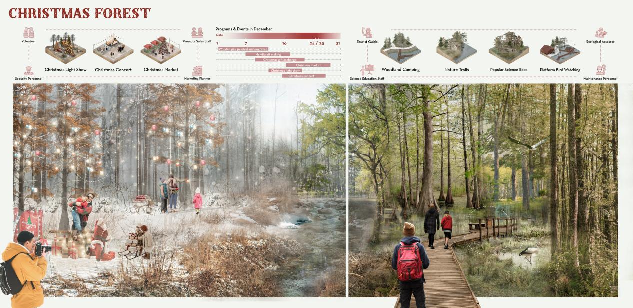 在社区与幽灵森林的界面上,我们设计了一系列社区活动场地,将圣诞节活动搬入自然场地中,呼吁减少圣诞树产业对自然生境的破坏。通过这种方式,不仅提高了社区居民的环保意识,还增强了人与自然的联系,促进了生态系统的保护与恢复。