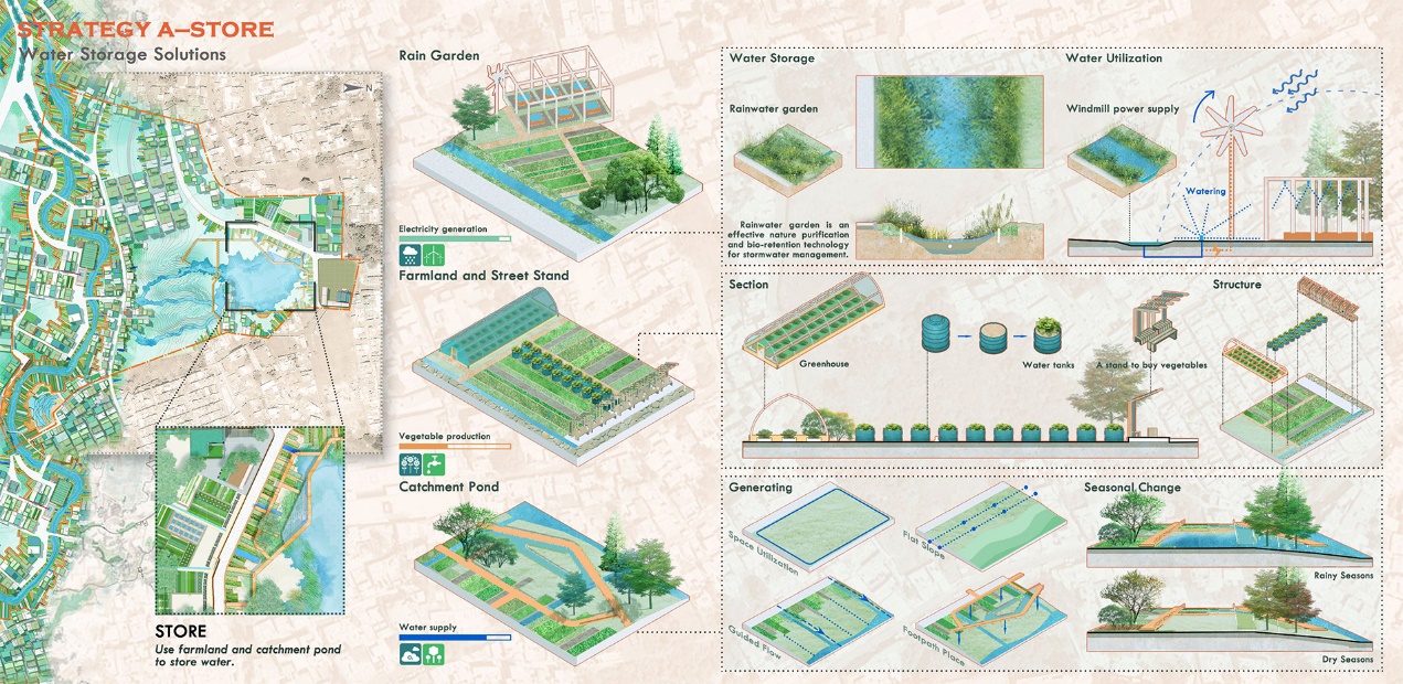 针对区域特点与问题,小组成员提出了四大解决策略:存储、延缓、保留和回用,利用雨水平衡策略与工具包(图4),将基于空间的水管理落实在场地中,以平衡雨水分配。