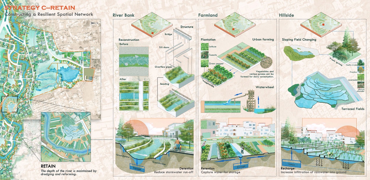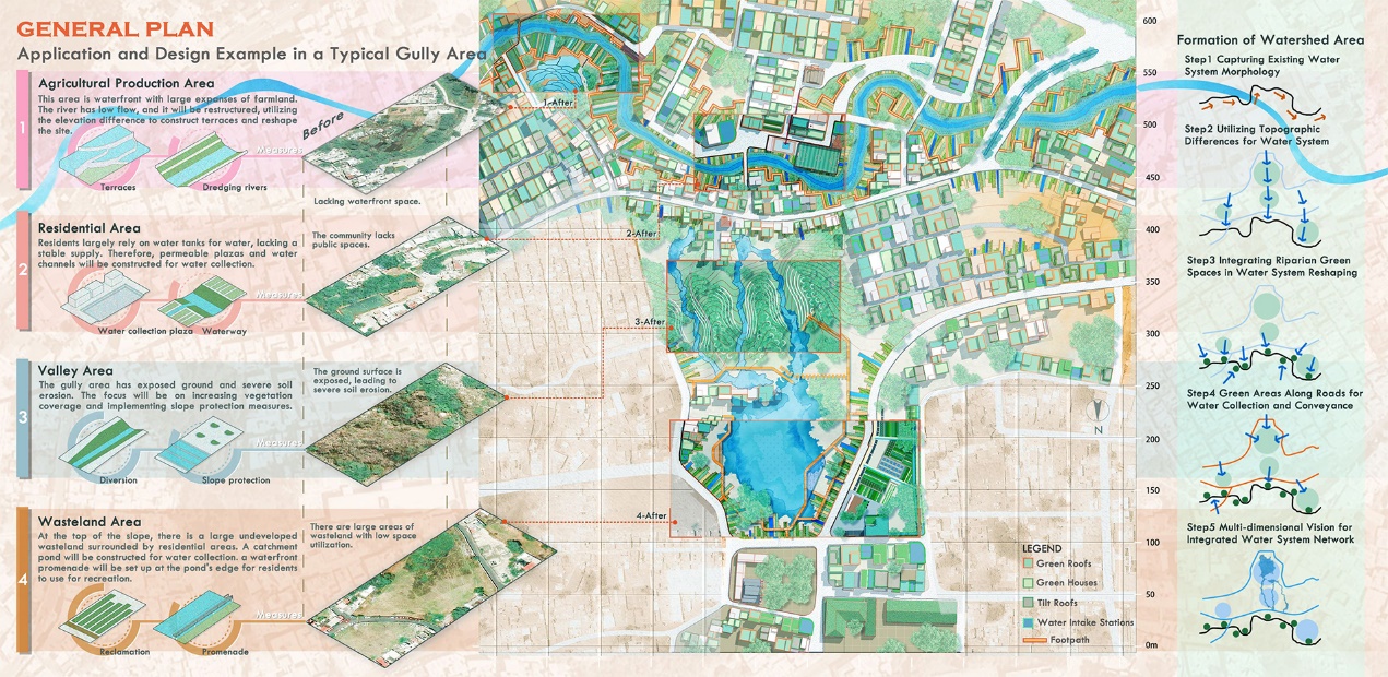 以一处典型沟壑区域的应用与设计为例(图5),将策略与工具包置入,详细设计了在实际场地中景观基础设施的应用,根据地形特征平衡不同季节雨水的运作机制(图6),展示雨水的组织与景观的互动。