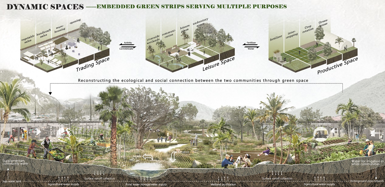 条带状绿地将承担生态、生产、休闲娱乐、贸易等多种功能(图10),两个社区对绿色空间的共同治理将促进功能性条带状绿色空间的融合。双方社区在这片绿地上共建共享,并共同受益于此,也为双方创造了一个平等对话交流的平台(图11)。