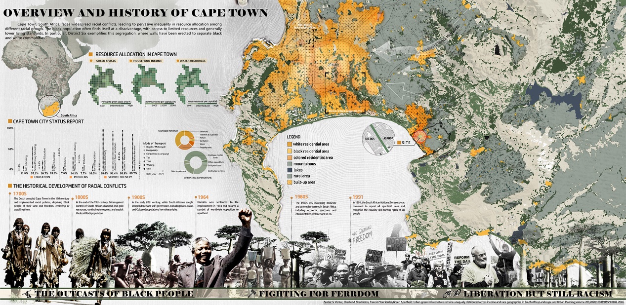 对于在南非开普敦内严重的种族不公问题,我们首先从分析南非开普敦种族割裂和资源分配不平等现象,梳理历史发展演变潮流中不同种族形势变化入手:由于自1949年开始,全白人政府通过了148项巩固种族隔离的法律,禁止白人与其他种族的人通婚,并颁布《人口登记法》,使得在开普敦等城市,种族区域法将非白人族群转移到隔离开城市地区,最优质以及靠近高价值房产的土地被分配给白人使用。最终超过80%的南非土地,被指定为少数民族的“白人”拥有。虽然在1997年,南非永久宪法生效标志着南非的种族隔离制度正式结束,但大部分黑人仍旧居住在城市边缘地带并面临着种族隔离、种族歧视、资源分配不公等困境(图2)。