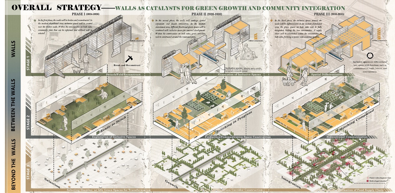 我们将通过“缝合”来处理墙壁内的废弃区域。通过拆除和重新组织墙壁的组成部分,我们将打破完全的隔离,并在墙壁周围创造包容的空间。这些包容的空间将逐渐转变为其他功能区域,如农田、贸易和艺术展览。类似条带的绿色空间将从墙体的改造部位开始生长,并随着时间的推移,两侧的绿色空间将扩展并最终相遇,将两个孤立的社区缝合在一起(图9)。